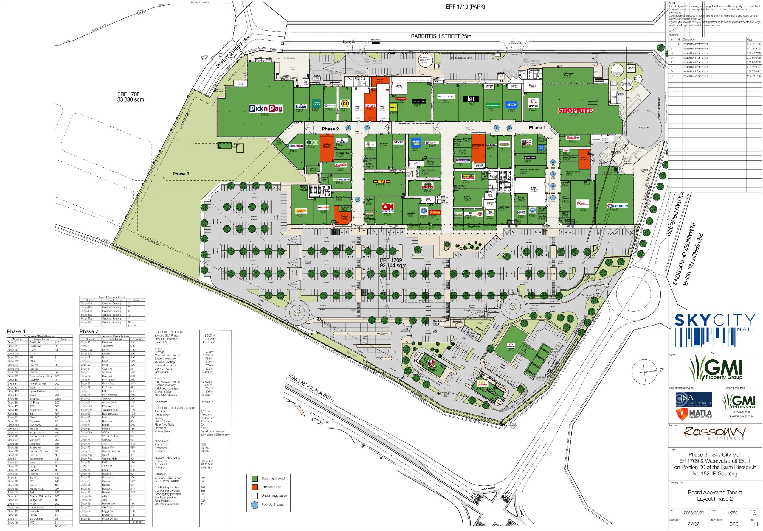 Phase 2: Doubled the GLA to 26000m² with a tally of 90 stores, including PnP and PnP Liquor, Clicks, The Truworths Group, Banking: (Capitec, FNB & Standard Bank), PnP Clothing, a food court extension was also completed – Hungry Lion and Romans Pizza.