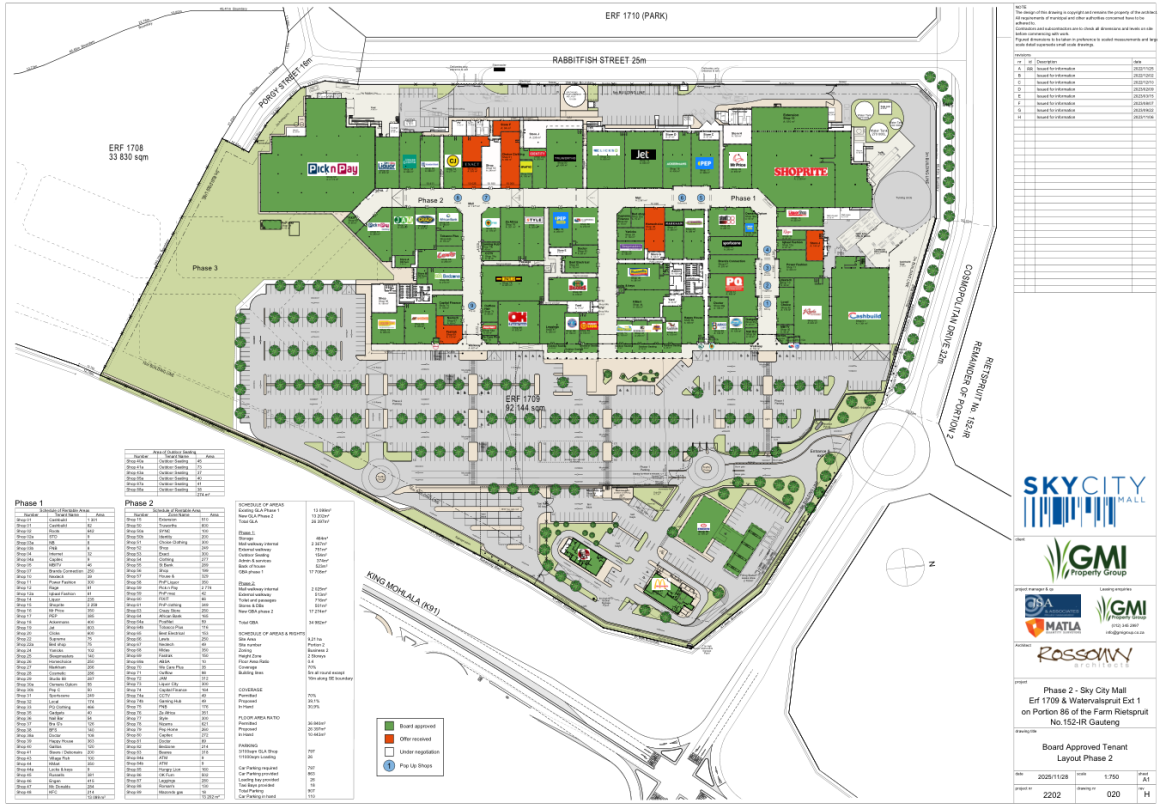 Phase 1: 13 000sq, adding Phase 2 doubled the GLA to 26000m2 with a tally of 50 stores, including PnP and PnP Liquor as Anchors, Clicks, The Truworths Group, Banking: (Capitec, FNB & Standard Bank), PnP Clothing, a food court extension was also completed – Hungry Lion and Romans Pizza.